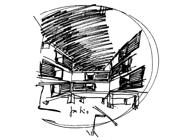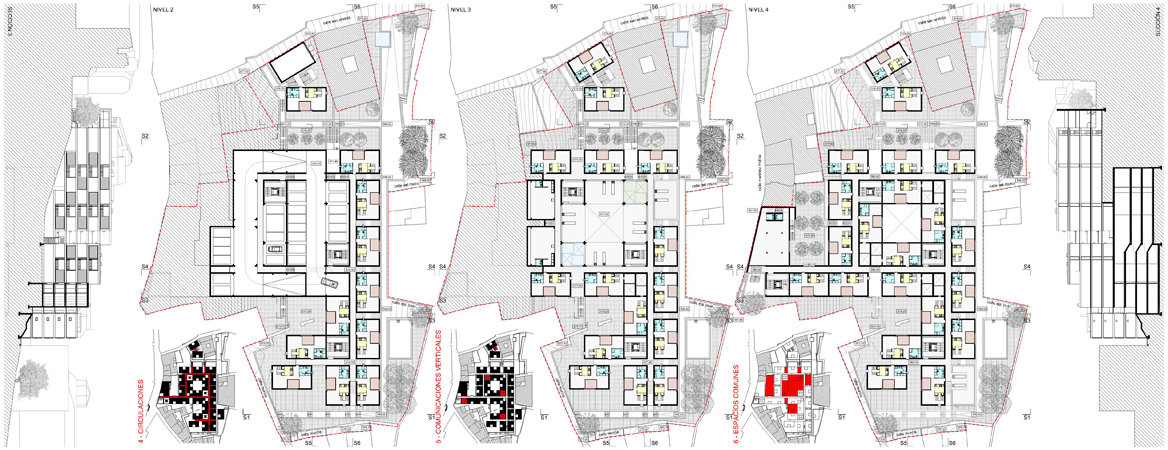 5. Un encadenamiento que también necesita establecerse en vertical, no solo para expresar la topografía, sino también para afirmar las mudanzas de uso que se van produciendo al escalar la pendiente - son patios, pozos de luz parcialmente ocupados, que perforan los espacios para relacionarlos.