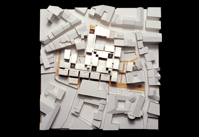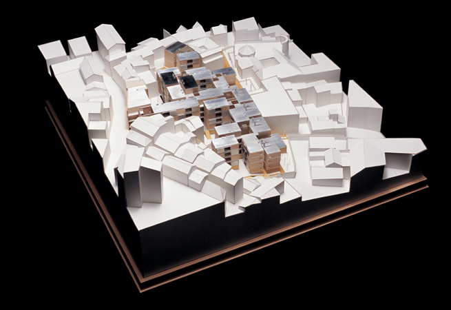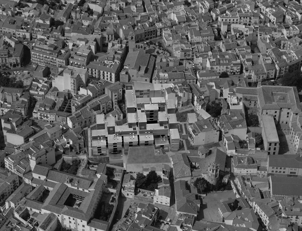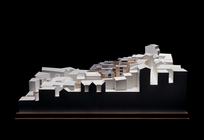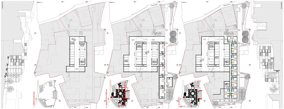 2. Perspectivas y alineaciones, la continuidad de las calles y de los accesos colocados sobre una topografía esculpida, los vacíos en el interior, una ocupación densa como su entorno, las descompresiones como origen de momentos singulares - patios grandes y pequeños con el paisaje como fondo, pero también la presencia de la luz y la sombra.