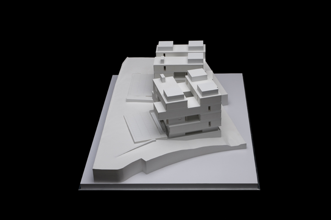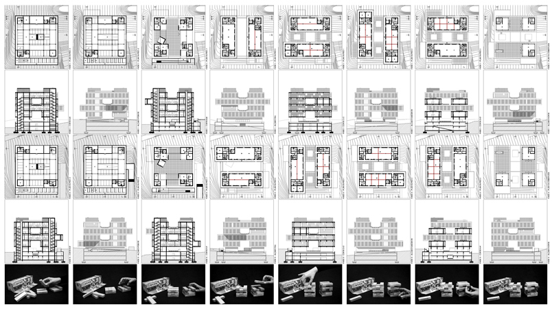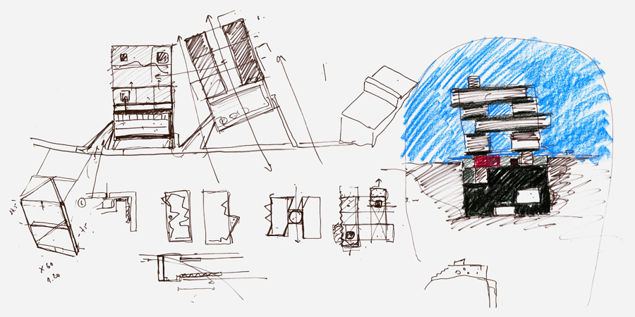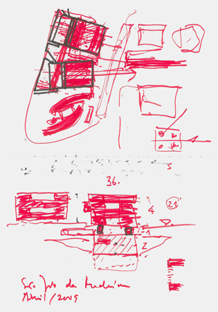 Así se explica el “posar” de los pisos superiores y las “patas” que los soportan, localizadas en la proximidad de los cuatro vértices que definen el perímetro exterior del podio que diseña la base del edificio, lo cual ya no es más que un mecanismo topográfico que sirve para “preparar” el terreno para recibir el edificio.